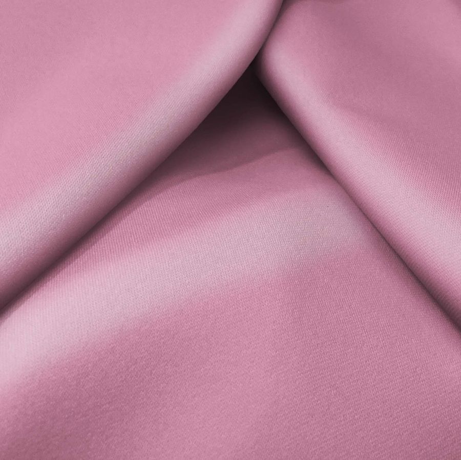 La tela base es la Sarga Bielástica - Lisboa, con una composición de 97% poliéster y 3% elastano, un gramaje de 209 gr/m2 y un ancho de 150 cm. El color liso impreso es rosa charm (7 55 13 0 en CMYK), que destaca por su tonalidad vibrante pero suave, y se combina bien con tonos neutros como el blanco y el negro. La tela está impresa con el color liso a una sola cara por impresión digital textil.