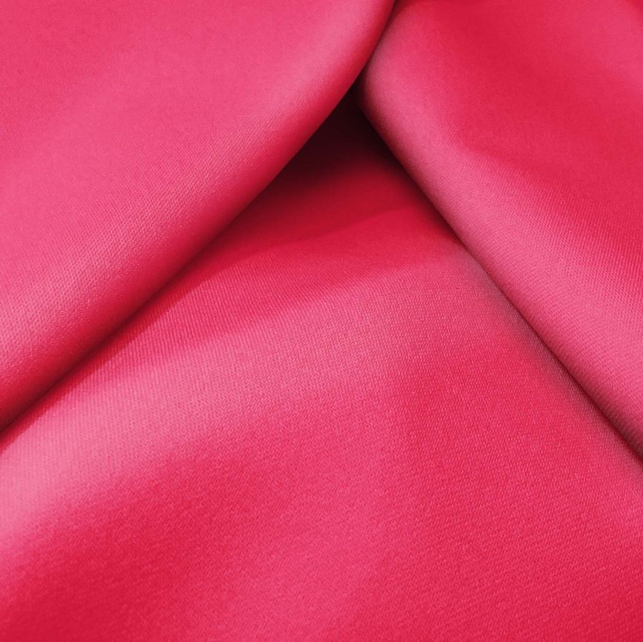 La tela base, Sarga Bielástica - Lisboa, está compuesta por un 97% de poliéster y un 3% de elastano, lo que le confiere un peso de 209 gr/m2 y un ancho de 150 cm. El color liso impreso en esta tela es Rosa Rojizo, con un CMYK de 0 90 51 0. Este color simboliza la dulzura y la pasión, y se combina bien con otras tonalidades como el beige, el gris y el negro.