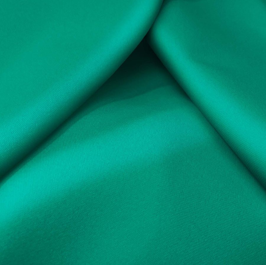 La tela base de esta descripción es la Sarga Bielástica - Lisboa, la cual está compuesta por un 97% de poliéster y un 3% de elastano, con un gramaje de 209 gr/m2 y un ancho de 150 cm. El color liso impreso es un verde acuático con un CMYK de 82 16 62 2, lo que nos indica que tiene una tonalidad suave y cálida.