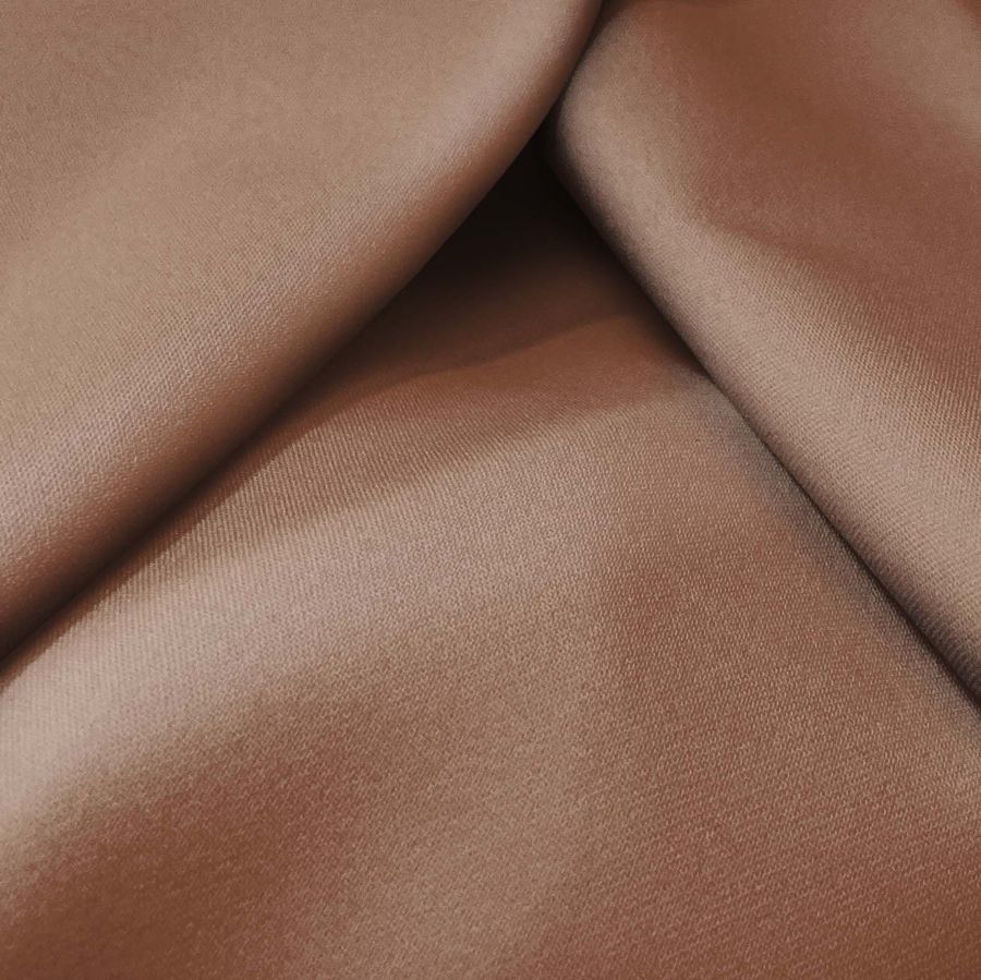 La tela base de esta descripción es una Sarga Bielástica - Lisboa de composición 97% POLIÉSTER y 3% ELASTANO, con un gramaje de 209 gr/m2 y un ancho de tela de 150 cm. El color liso impreso es Marrón Canela, representado por un CMYK de 35 55 61 39. Este color liso simboliza la tierra y el calor, con una textura sueva, y combina en particular con tonos beige, crema y marfil.