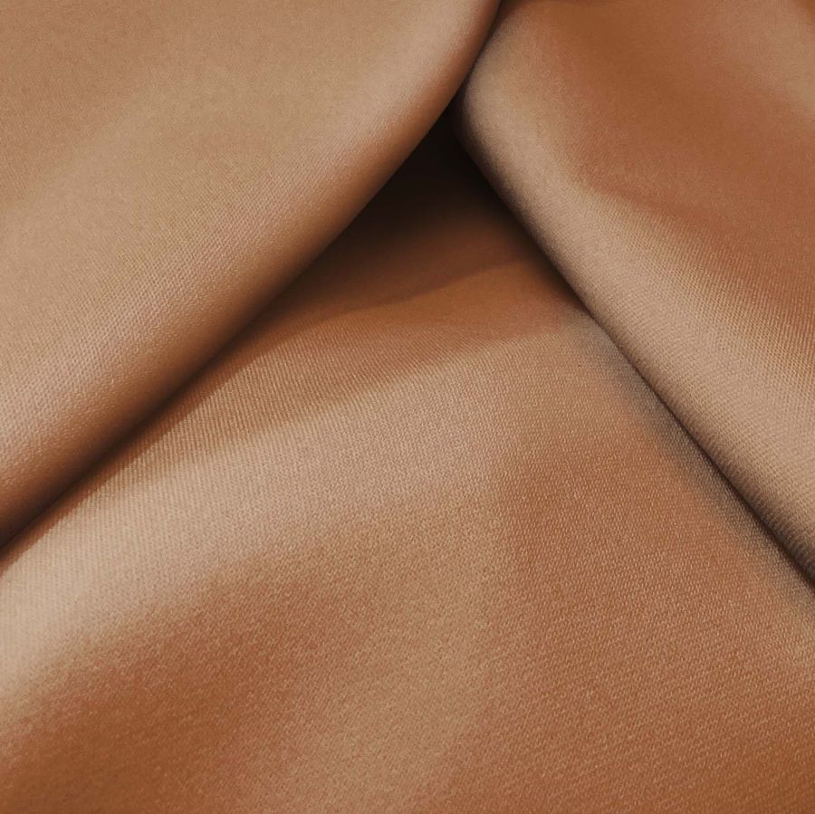 La tela base, Sarga Bielástica - Lisboa, está compuesta por 97% poliéster y 3% elastano, con un gramaje de 209 gr/m2 y un ancho de 150 cm. El color liso impreso es marrón canela en rama, con valores CMYK de 30 56 70 28. Este color es cálido y terroso, evocando la calidez y la estabilidad. Se combina bien con otros tonos de marrón, verde oliva y grises suaves.