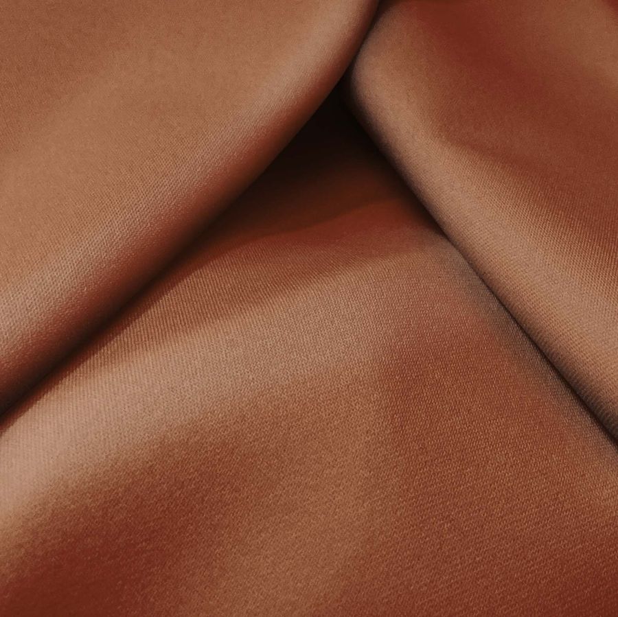 La tela base de este producto es Sarga Bielástica - Lisboa, compuesta en un 97% de poliéster y un 3% de elastano, con un gramaje de 209 gr/m2 y un ancho de 150 cm. El color liso impreso en esta tela es un Marrón Momia, que se crea a través de una combinación de 34% de tinta Cyan, 71% de tinta Magenta, 83% de tinta Yellow y 42% de tinta Black, con un código CMYK de 34 71 83 42. Este color secundario presenta una sensación terrosa y cálida, complementándose especialmente bien con tonos cálidos y dorados. Es importante destacar que la impresión se realiza en una sola cara por impresión digital textil.