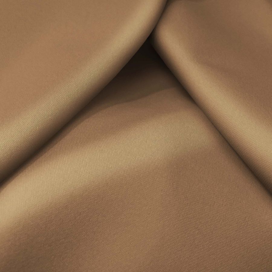 La tela base de este tejido es Sarga Bielástica - Lisboa, compuesta por un 97% de poliéster y un 3% de elastano, con un gramaje de 209 gr/m2 y un ancho de 150 cm. El color liso impreso es un marrón con tintas de cian, magenta, amarillo y negro con un CMYK de 31 48 64 26. Este color marrón, también conocido como Nicotina, presenta un tono terroso y cálido, combinable con matices beiges y ocres.