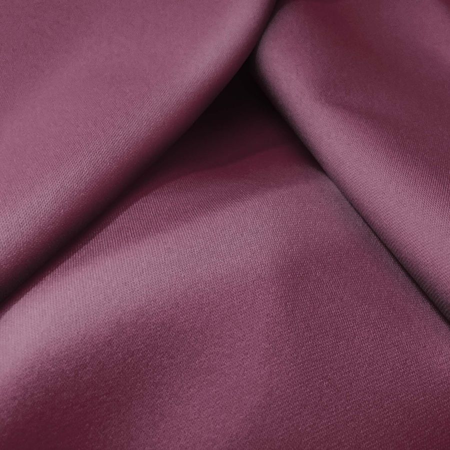 La tela base es la Sarga Bielástica - Lisboa, con una composición del 97% de poliéster y 3% de elastano, un gramaje de 209 gr/m2, una anchura de 150 cm y una textura elástica y suave al tacto. El color liso impreso es Morado, Malva Antiguo, con un CMYK de 47 81 41 45. Este color se describe como vivo, cálido y elegante, combinando perfectamente con tonos como el gris, el beige y el blanco.
