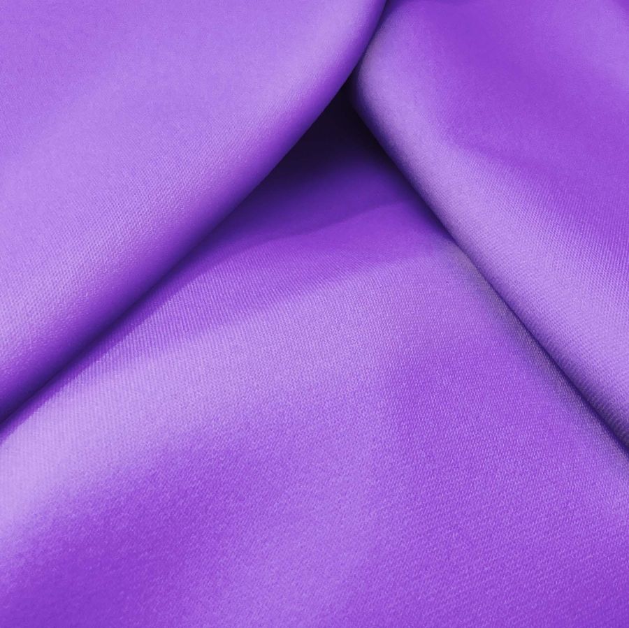 La tela base es la Sarga Bielástica - Lisboa, compuesta por 97% poliéster y 3% elastano, con un gramaje de 209 gr/m2 y un ancho de 150 cm. Su color liso impreso es una combinación de morado, azul marino y púrpura, con un CMYK de 67 70 0 0. Este color crea una sensación de misterio y sofisticación, y combina bien con tonos neutros y blanco.