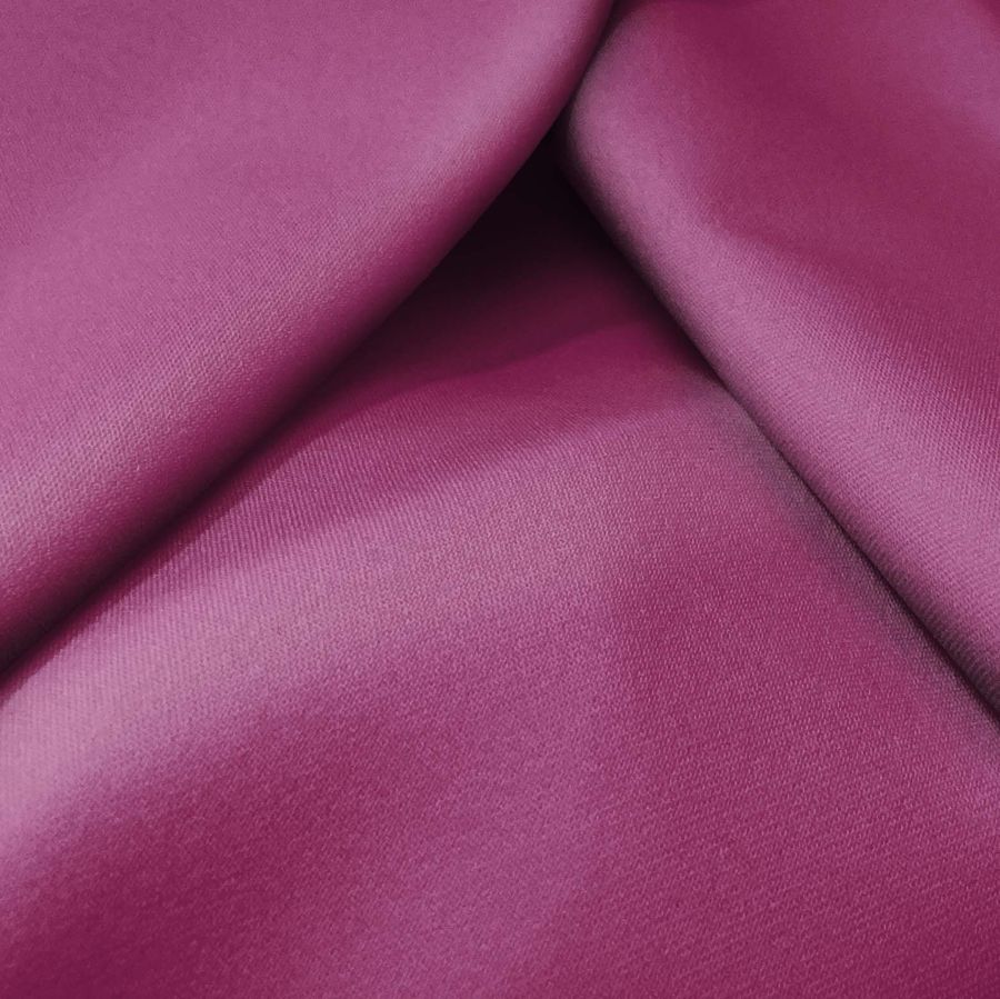 La tela base Sarga Bielástica - Lisboa presenta una composición de 97% poliéster y 3% elastano con un gramaje de 209 gr/m2 y ancho de 150 cm. El color liso impreso es de tonalidad Morado, Boysemberry, con un CMYK de 44 88 29 21. Este color, además de ser bello, simboliza la creatividad, la sabiduría y la ambición. En términos técnicos, su tonalidad violeta oscila entre la gama cromática del rojo y el azul, lo que invita a mezclarse perfectamente con otros colores de dicha gama. En efecto, puede combinarse con blanco, cremas o grises para demosntrar una armonía suave y equilibrada; también con tonalidades más oscuras de azul o verde para contrastar y generar una fuerza mayor en el diseño. Cabe resaltar que el tejido está impreso con color liso a una sola cara por impresión digital textil, lo que significa que el diseño impreso es nítido y vibrante.