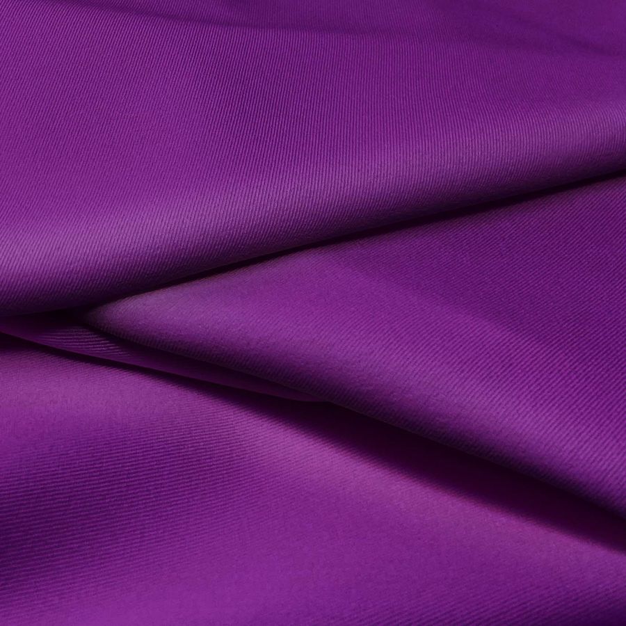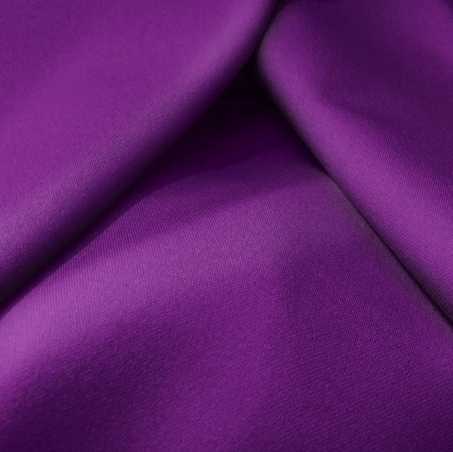 La tela base, Sarga Bielástica - Lisboa de 209 gr/m2 y 150 cm de ancho, está compuesta por 97% poliéster y 3% elastano. Su color liso impreso es un Morado Mora, con un CMYK de 82 100 29 24. Este color simboliza la elegancia, la extravagancia y la creatividad, y se combina bien con tonos grises, rosados y dorados. El tejido está impreso con el color liso a una sola cara por impresión digital textil, lo que significa que no es un tejido tintado, sino impreso por una sola cara.
