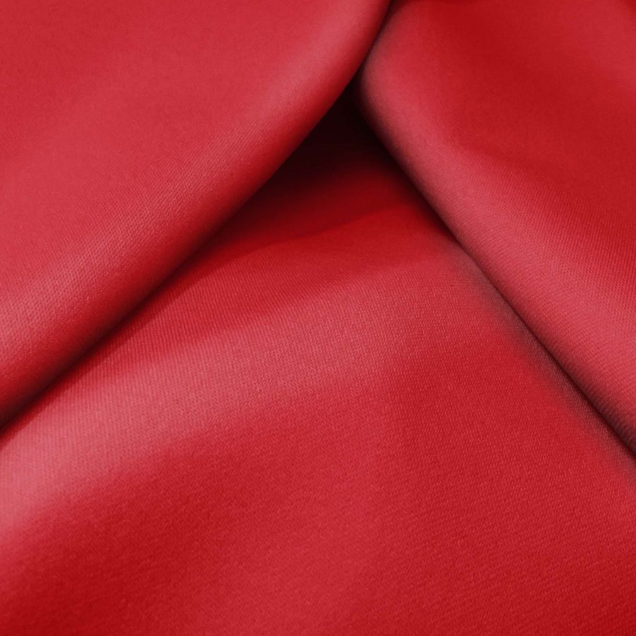 La tela base de esta prenda es la Sarga Bielástica - Lisboa, compuesta por un 97% de poliéster y un 3% de elastano, con un gramaje de 209 gr/m2 y un ancho de 150 cm. El color liso impreso es un granero rojo, con un CMYK de 20 100 95 13. Este color se caracteriza por ser intenso y vibrante, y combina especialmente bien con colores neutros como el blanco y el negro, así como con tonos tierra y dorados.