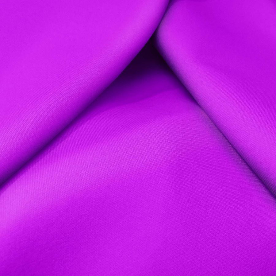 La tela base de este tejido es la Sarga Bielástica - Lisboa, compuesta por 97% de poliéster y un 3% de elastano, con un gramaje de 209 gr/m2 y un ancho de 150 cm. El color liso impreso es de Morado Púrpura Eléctrico, con un contenido de CMYK en la tinta Cyan de 64, en la tinta Magenta de 81, en la tinta Yellow de 0, y en la tinta Black de 0. Este color transmite una energía eléctrica, una vibra futurista y misteriosa que llama la atención. El Púrpura Eléctrico combina muy bien con el blanco, negro, gris, beige, y dorado, destacando en ambientes modernos y vanguardistas. Hay que tener en cuenta que el tejido está impreso con este color liso a una sola cara por impresión digital textil, lo que significa que es un tejido impreso y no tintado.