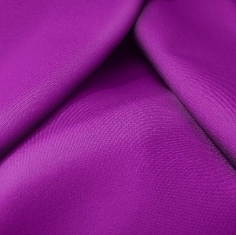 La tela base de este tejido es Sarga Bielástica - Lisboa, compuesta por un 97% de poliéster y un 3% de elastano, con un gramaje de 209 gr/m2 y un ancho de 150 cm. El color liso impreso es morado, con un tono purpura real cuyo CMYK es 64 100 4 1. Este color secundario se caracteriza por ser un tono intenso, equilibrado y elegante, destacando por su vibración y profundidad. Combina especialmente con tonalidades más claras como el blanco, el rosa palo o el gris claro.
