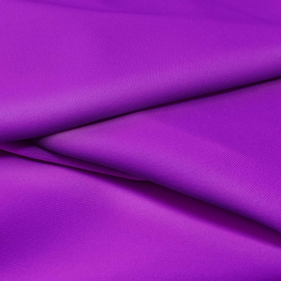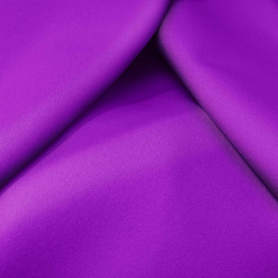 La tela base, Sarga Bielástica - Lisboa, es un tejido de poliéster y elastano con un gramaje de 209 gr/m2 y un ancho de 150 cm. Su color liso, Morado-Violeta Artístico, se consigue con una combinación de cian (69) y magenta (91), sin presencia de amarillo ni negro. Este color es asociado a la creatividad, la sensibilidad y el misterio. Además, se combina especialmente bien con tonos cálidos, como naranja, rosa y rojo. Cabe destacar que, el tejido está impreso con el color liso a una sola cara por impresión digital textil.