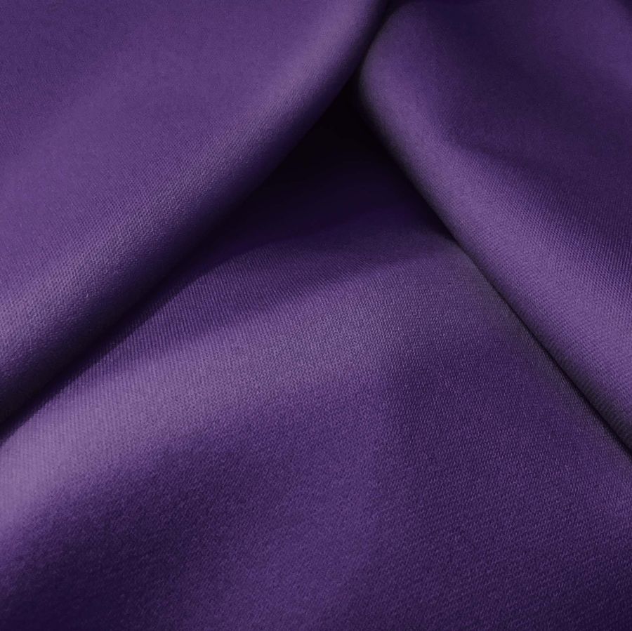 La tela base Sarga Bielástica - Lisboa es de composición 97% poliéster y 3% elastano, con un gramaje de 209 gr/m2 y un ancho de 150cm. El color impreso es Morado-Violeta Ruso, compuesto por una mezcla de tintas CMYK, siendo el porcentaje de Cyan 94, Magenta 100, Yellow 34 y Black 36. Este color secundario combina perfectamente con tonos como gris oscuro, azul marino y blanco. Es importante destacar que la tela base está impresa con este color a una sola cara por impresión digital textil.
