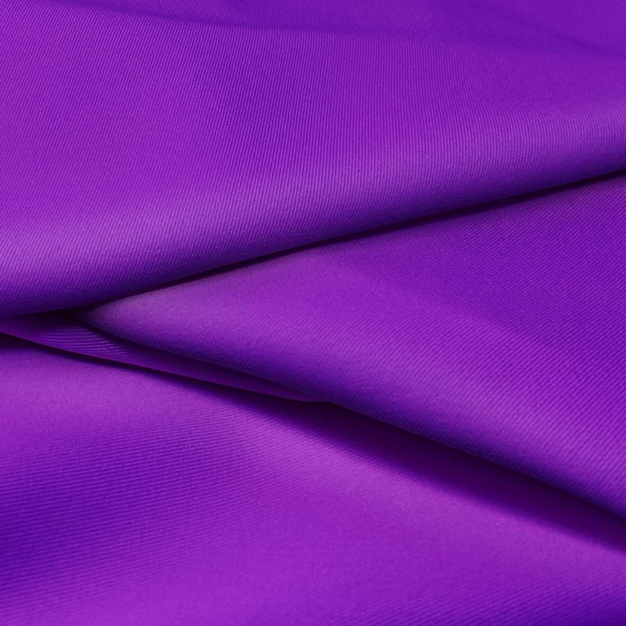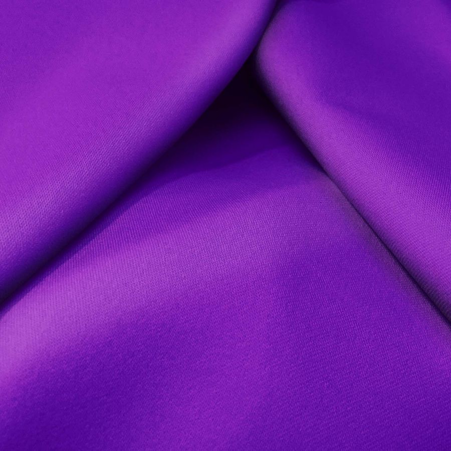 La tela base de este tejido es la Sarga Bielástica - Lisboa, compuesta por un 97% de poliéster y un 3% de elastano, con un gramaje de 209 gr/m2 y un ancho de 150 cm. El color liso impreso es de un tono Morado Violeta sólido, con una combinación CMYK de 80 95 0 0. Este color se asemeja a la flor iris, evocando la creatividad y la elegancia. El color Morado Violeta sólido combina perfectamente con tonos naturales y cremas, así como con tonos más atrevidos como rosa y turquesa.