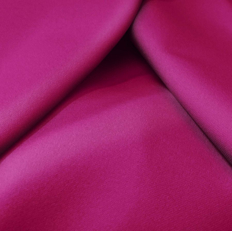 La tela base Sarga Bielástica - Lisboa se destaca por su composición de 97% poliéster y 3% elastano, su gramaje de 209 gr/m2 y un ancho de 150 cm. Su color liso impreso en Morado-Violeta Rojizo, con un CMYK de 33 100 28 25, añade un toque de elegancia y sofisticación. Este color secundario combina a la perfección con tonalidades neutras como el blanco, negro y gris, creando un equilibrio perfecto para la moda de mujer o accesorios.