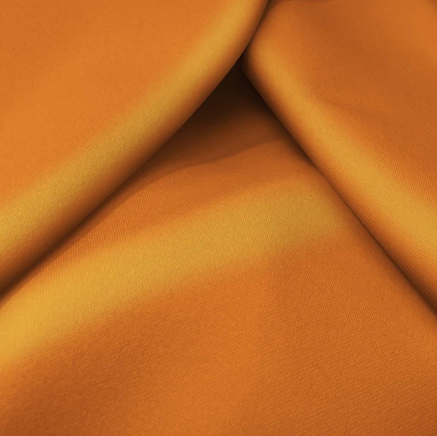 El tejido base es la Sarga Bielástica - Lisboa, compuesta por un 97% de poliéster y un 3% de elastano con un gramaje de 209 gr/m2 y un ancho de 150 cm. El color liso impreso es Naranja Gigante, el cual se obtiene con una combinación de tinta Magenta y Yellow en un 65% y 88% respectivamente y sin presencia de Cyan ni Black en su CMYK. Este color se caracteriza por su intensidad y vitalidad, evocando emociones de energía y alegría. Su simbología está asociada con la creatividad, la pasión y la vitalidad. Combina muy bien con tonos azules o verdes, ofreciendo contrastes equilibrados y atractivos.