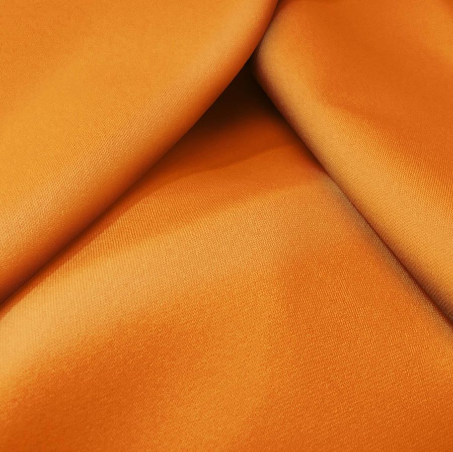 La tela base Sarga Bielástica - Lisboa es una sarga compuesta por 97% poliéster y 3% elastano con un gramaje de 209 gr/m2 y una medida de ancho de 150 cm. El color liso impreso en esta tela es un naranja aeroespacial que se obtiene a través de la tecnología de sublimación con los siguientes valores de CMYK: 0 69 100 0. Este color naranja es un tono vibrante y atractivo que combina especialmente bien con otros colores como el blanco, negro, gris y tonos verdes.
