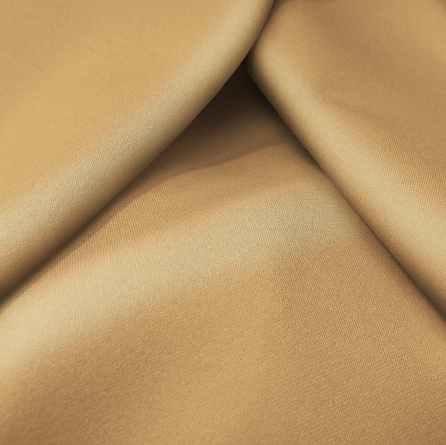 La tela base es la Sarga Bielástica - Lisboa, compuesta por un 97% de poliéster y un 3% de elastano, con un gramaje de 209 gr/m2 y un ancho de 150 cm. El color liso impreso en esta tela es Naranja Persa, con valores CMYK de 13 38 63 2, lo que indica una tonalidad vibrante y cálida con una baja presencia de la tinta negra. Este color se combina especialmente bien con tonos neutros como el beige o el gris para crear un equilibrio cromático.