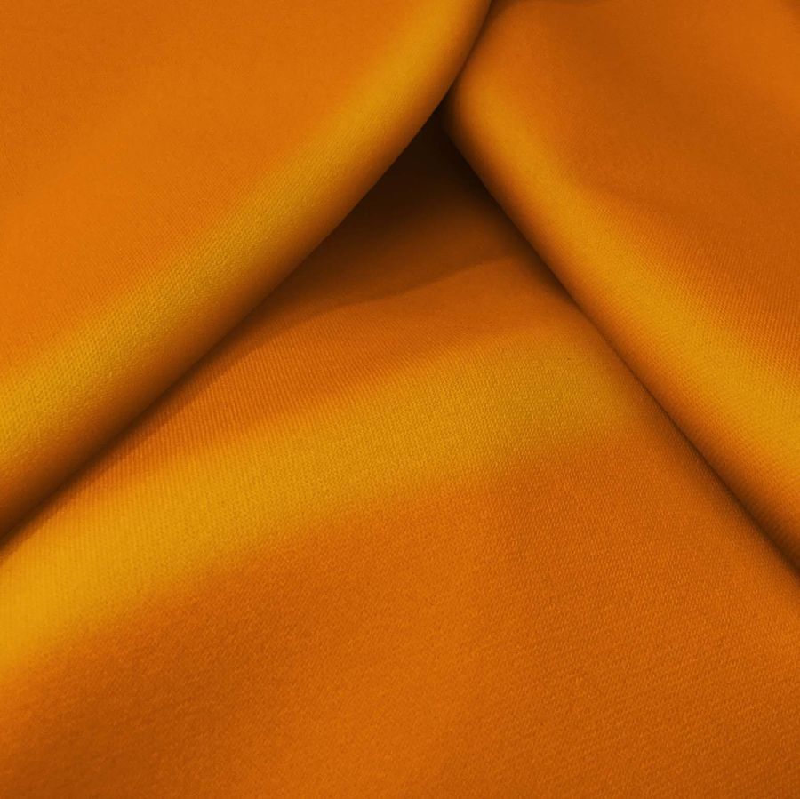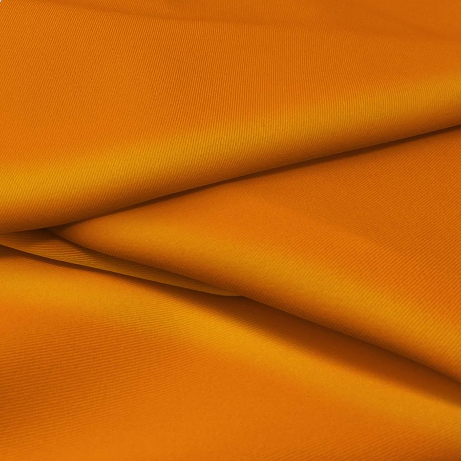 La tela base de este tejido es la Sarga Bielástica - Lisboa, compuesta por 97% de poliéster y 3% de elastano, con un gramaje de 209 gr/m2 y un ancho de 150 cm. El color liso impreso es Naranja Tangelo, con valores de CMYK de 2-70-100-0, lo que indica una tonalidad anaranjada tirando más hacia el amarillo, con una intensidad relativamente alta en la escala de saturación y un tono algo apagado. Combina bien con tonalidades grises, blancas y negras para un look más sobrio, o con verdes y rosas claros para una apariencia más alegre y vibrante. El tejido está impreso con el color liso a una sola cara por impresión digital textil, lo que significa que el color se adhiere a la superficie del tejido y no penetra en su estructura como sucede con los tejidos tintados.