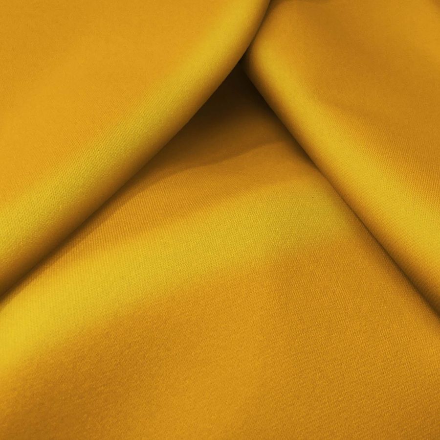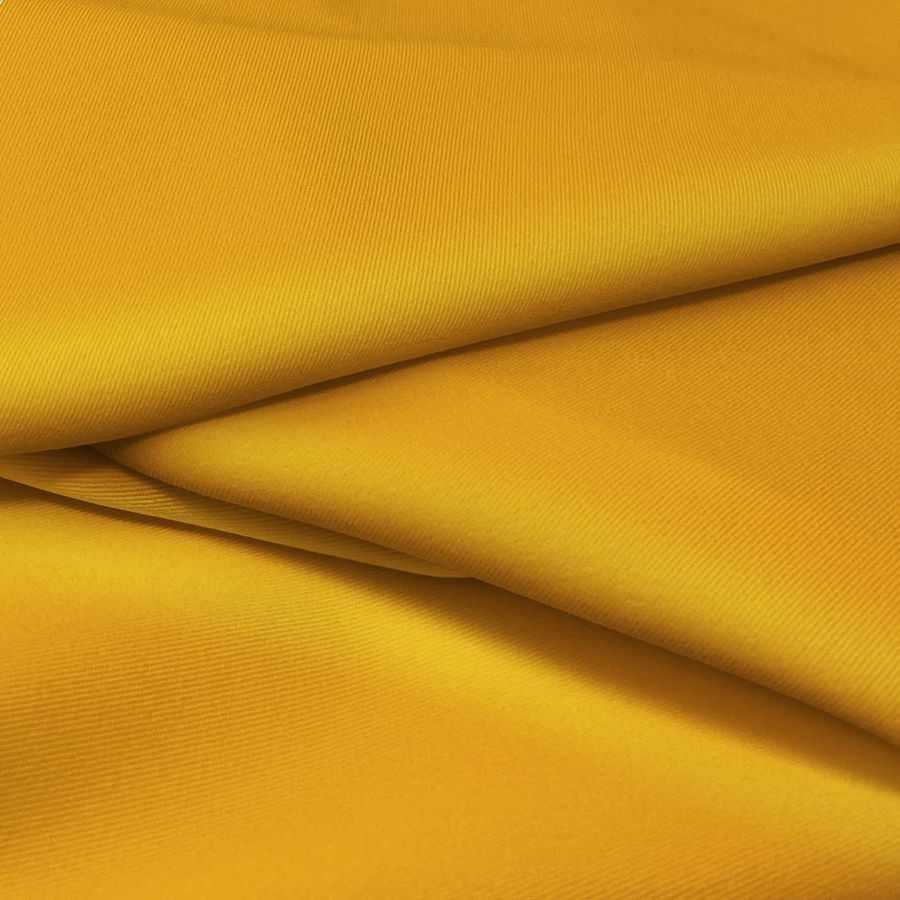 La tela base, Sarga Bielástica - Lisboa, está compuesta por 97% POLIÉSTER y 3% ELASTANO, con un gramaje de 209 gr/m2 y un ancho de 150 cm. Su color liso impreso es Amarillo Caléndula (CMYK: 0 49 93 0), que refleja un tono brillante y vibrante. Este color combina bien con otros tonos cálidos y vivos como el naranja, el rojo y el rosa.