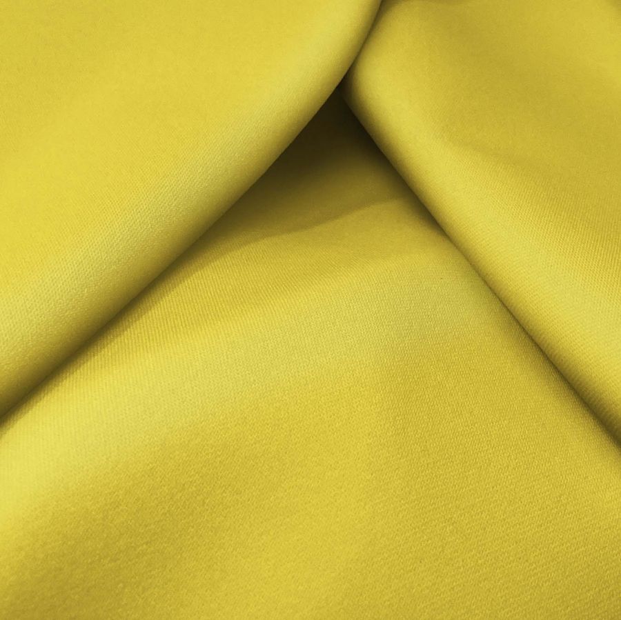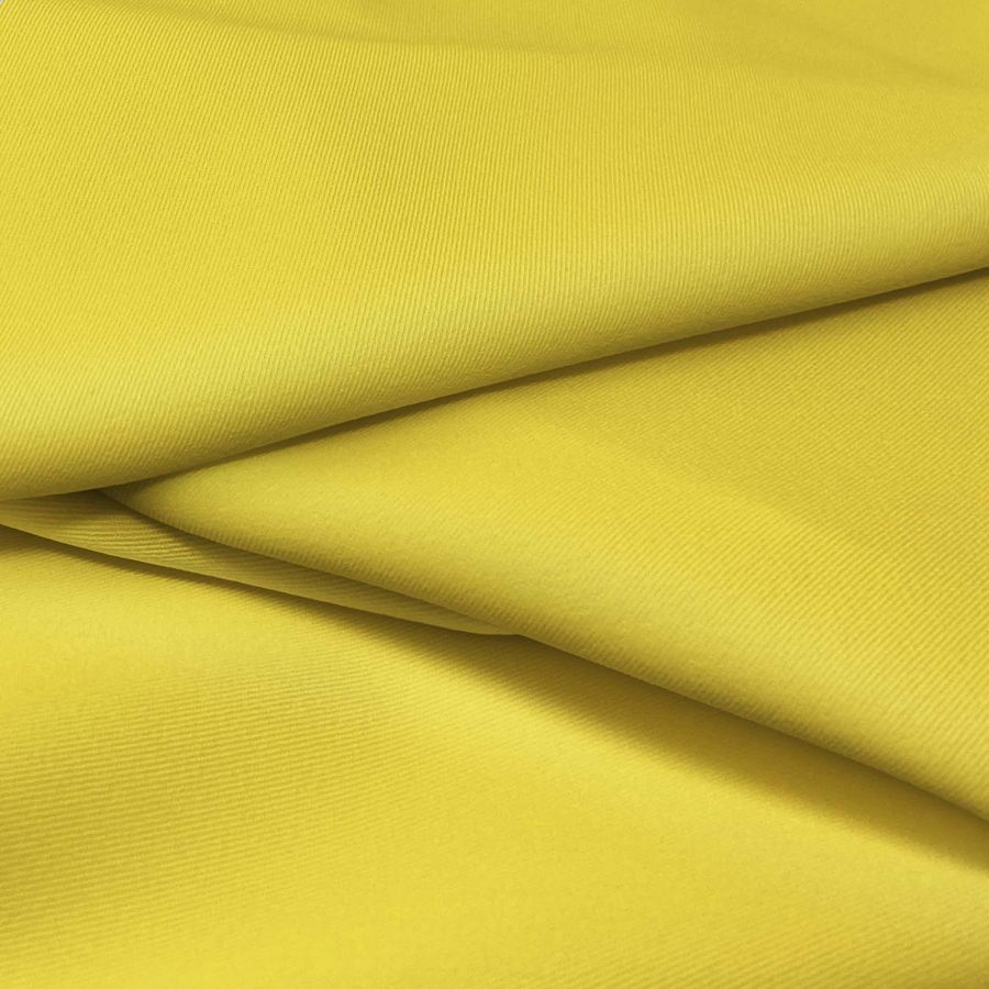 La tela base, Sarga Bielástica - Lisboa, está compuesta por un 97% de poliéster y un 3% de elastano con un gramaje de 209 gr/m2 y un ancho de 150 cm. El color liso impreso sobre ella es amarillo girasol, con un contenido de tinta cyan de 2, magenta de 13 y yellow de 81, para un CMYK de 2 13 81 0. Este color simboliza la luz, la energía y la felicidad, y técnicamente es suave y vibrante. Combina especialmente bien con tonos azules y verdes, creando una sensación equilibrada y armónica.