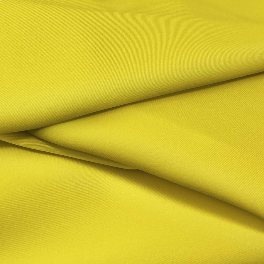 La tela base de este tejido es una Sarga Bielástica - Lisboa de 97% POLIÉSTER y 3% ELASTANO, con un gramaje de 209 gr/m2 y un ancho de 150 cm. El color liso impreso es un amarillo Goya, obtenido con una técnica de sublimación que utiliza las tintas Cyan 2, Magenta 10, Yellow 86 y Black 0 en una proporción de 2 10 86 0 en el modelo CMYK. Este color es simbólicamente brillante y alegre, y técnicamente muy fácil de combinar con otros colores cálidos como naranja, rojo y rosa.