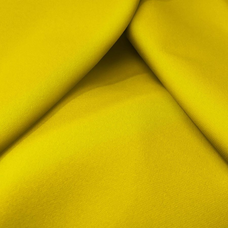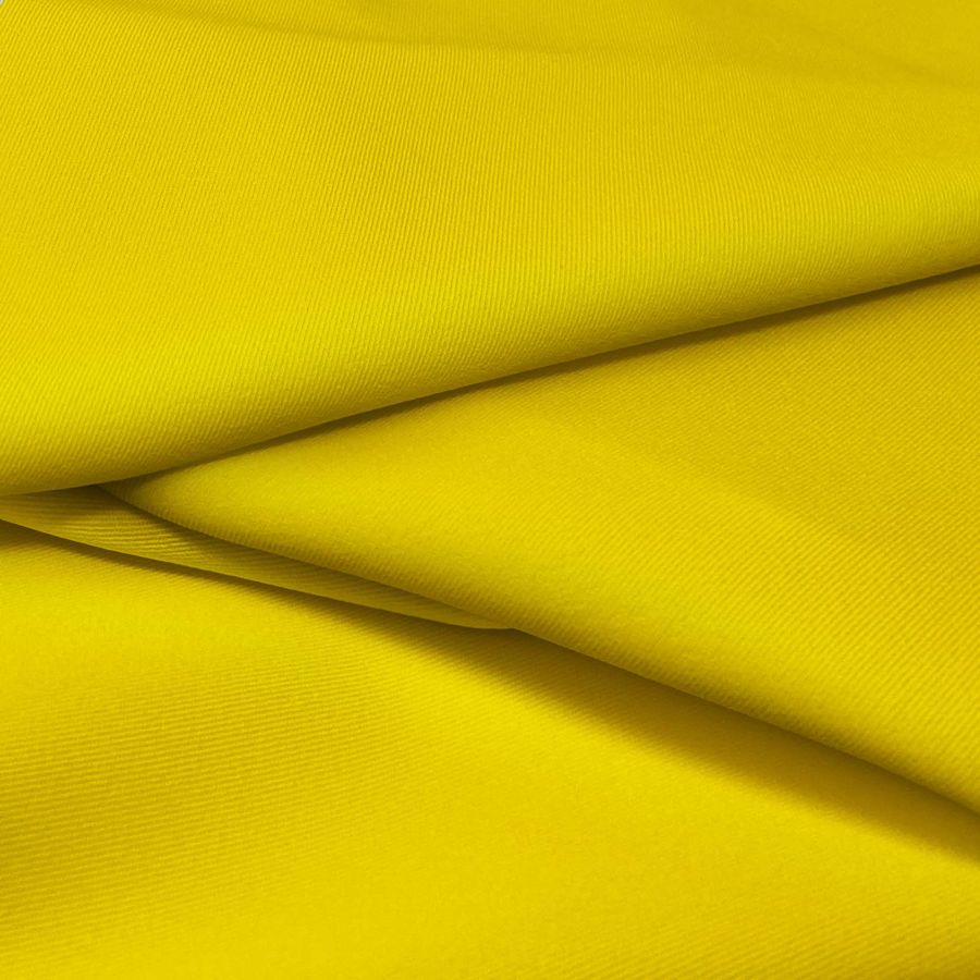 La tela base es la Sarga Bielástica Lisboa, compuesta por un 97% de poliéster y un 3% de elastano, con un gramaje de 209 gr/m2 y un ancho de 150 cm. El color liso impreso es el Amarillo Hansa con un CMYK: 0 20 93 0. Se trata de un color intenso y vibrante que se asemeja al amarillo puro y brillante de la flor de la caléndula. Este color se combina muy bien con tonos tierra, naranjas y verdes.