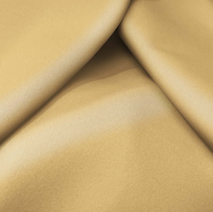 La tela base, Sarga Bielástica - Lisboa, se compone de 97% poliéster y 3% elastano, con un gramaje de 209 gr/m² y una anchura de 150 cm. Su color liso impreso es amarillo macarrón, con un CMYK de 0 27 58 0. Este tono simboliza la alegría, la luz y el optimismo, y técnicamente se trata de un color cálido y brillante que nos evoca al verano y al sol. Combina principalmente con otros tonos cálidos, como los naranjas y rojos, pero también va bien con tonos fríos, como los verdes y azules suaves. Cabe destacar que la tela está impresa únicamente en una de sus caras por impresión digital textil, lo que significa que su color es uniforme y preciso.