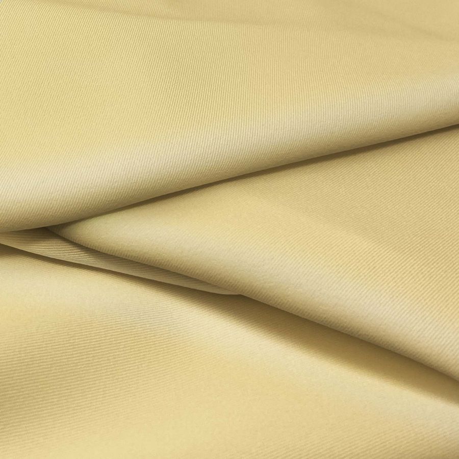 La tela base es la Sarga Bielástica - Lisboa, compuesta por un 97% de poliéster y un 3% de elastano, con un gramaje de 209 gr/m2 y un ancho de 150 cm. El color liso impreso es un amarillo miel intenso, cuyo CMYK es 0 16 53 0, lo que indica un alto nivel de amarillo y una mínima cantidad de magenta.