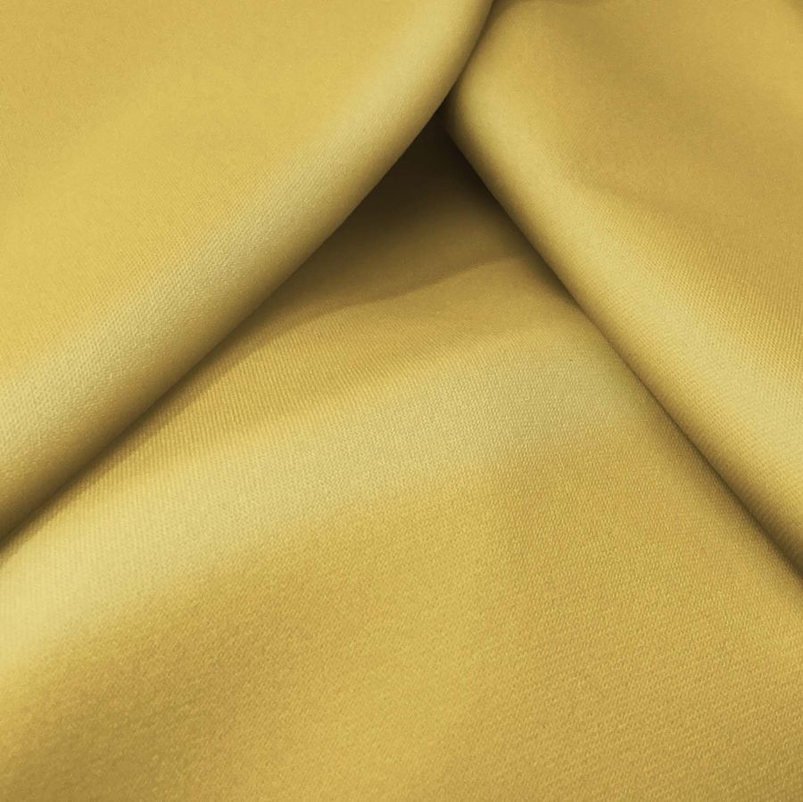 La tela base, Sarga Bielástica - Lisboa, está compuesta por 97% poliéster y 3% elastano, con un gramaje de 209 gr/m2 y una anchura de 150 cm. Su color liso impreso, Amarillo Mimosa, se caracteriza por tener una tinta Cyan de 6, una Magenta de 26, una Yellow de 72 y un porcentaje de Black del 0, con un CMYK de 6 26 72 0. Este color simboliza la felicidad y la alegría, representando la vitalidad y el optimismo en la moda. El Amarillo Mimosa es un color secundario que combina particularmente bien con tonos azules y verdes, permitiendo crear combinaciones alegres y frescas.
