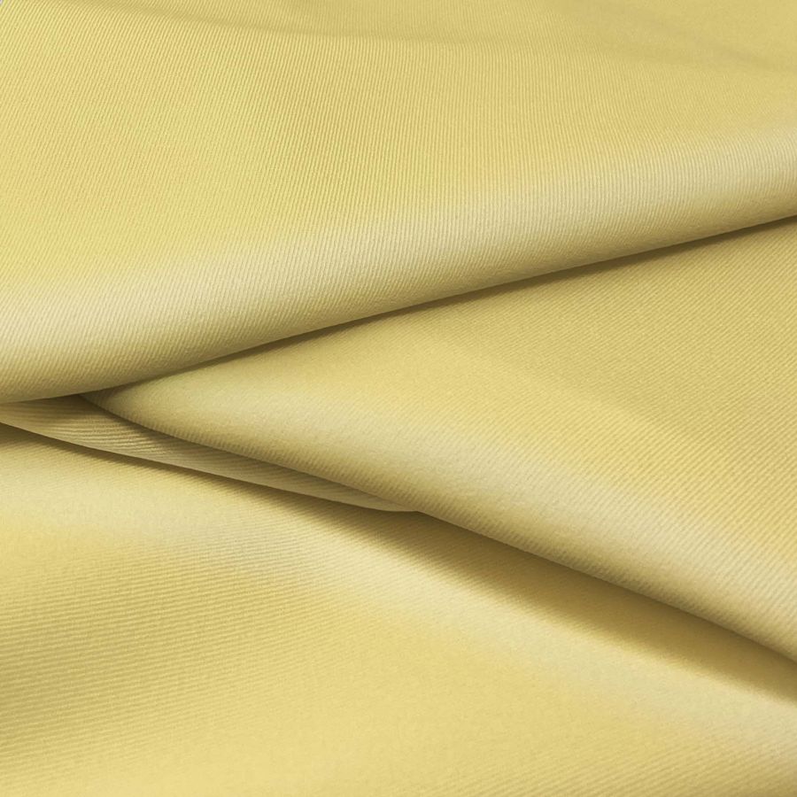 La tela base de este tejido es la Sarga Bielástica - Lisboa, compuesta por un 97% de poliéster y un 3% de elastano, con un gramaje de 209 gr/m2 y una amplitud de 150cm. El color liso impreso es un amarillo tigre, con los siguientes valores en el CMYK: 0 13 59 0, lo que le da un tono amarillo con un matiz anaranjado y marrón, lo que a su vez le confiere una presencia vibrante y enérgica. Este color secundario combina bien con colores neutros como el blanco o el gris, marrones, verdes y azules oscuros. Recordar que esta tela está impresa con este color liso en una sola cara por impresión digital textil.