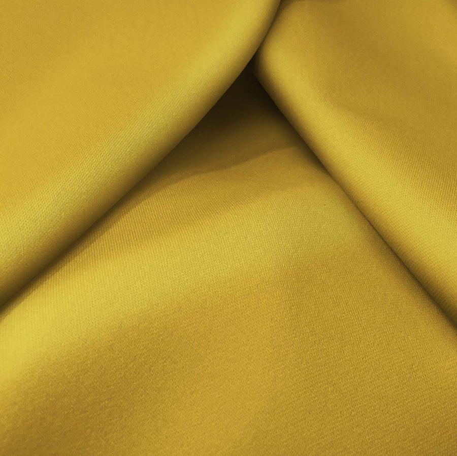 La tela base es la Sarga Bielástica - Lisboa, compuesta por 97% de poliéster y 3% de elastano, con un gramaje de 209 gr/m2 y ancho de 150 cm. El color liso impreso es amarillo curry, con un CMYK de 16 35 88 4. Este tono amarillo intenso y cálido evoca la energía y vitalidad del sol, y simboliza además la prosperidad, la felicidad y la confianza. Combina especialmente bien con colores complementarios como el azul, el violeta y el verde. Es importante señalar que el tejido está impreso con el color liso a una sola cara por impresión digital textil, lo que significa que no es un tejido tintado sino impreso por una sola cara.