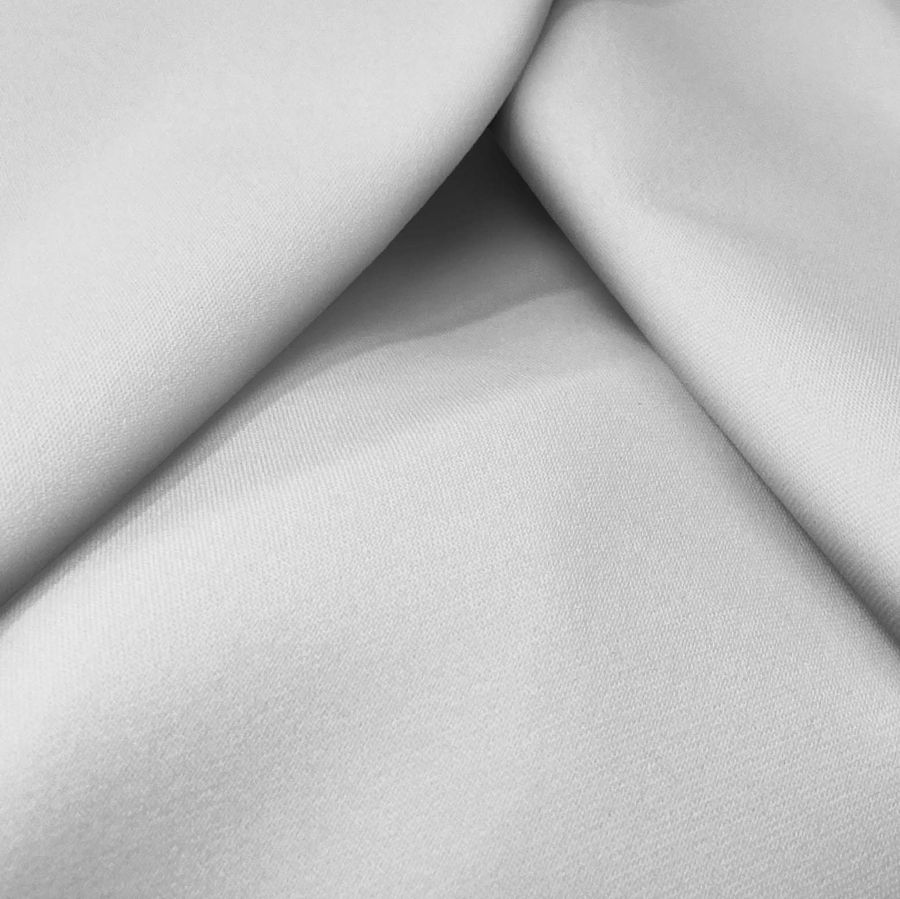 La tela base es la Sarga Bielástica - Lisboa, compuesta por un 97% de poliéster y un 3% de elastano, con un gramaje de 209 gr/m2 y un ancho de 150 cm. El color liso impreso es gris humo blanco con un CMYK de 5 4 4 0, combinando tonos grises y blancos para dar una sensación de elegancia y sofisticación. La tonalidad secundaria del color es un gris medio, el cual combina perfectamente con grises más oscuros, tonalidades grises más suaves y blancos. La tela está impresa con el color liso a una sola cara por impresión digital textil.
