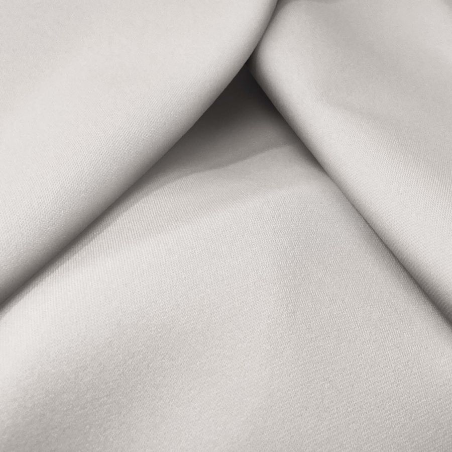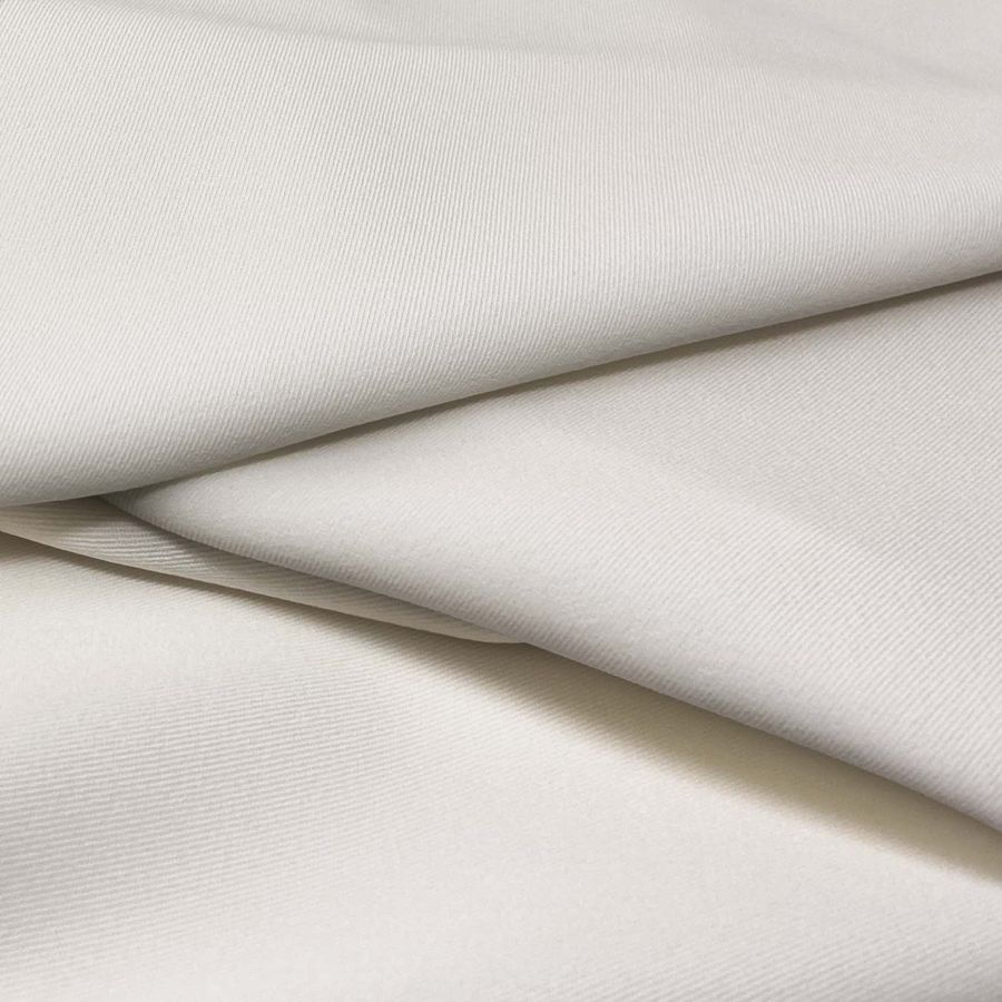 La tela base es la Sarga Bielástica - Lisboa, con una composición de 97% poliéster y 3% elastano, un gramaje de 209 gr/m2 y un ancho de 150 cm. El color liso impreso es blanco concha, con un CMYK de 0 5 7 0. Este color secundario presenta tonos suaves y cálidos que evocan la tranquilidad y la serenidad. Combina perfectamente con otros tonos crema, beige, marrón y dorado, otorgando una elegancia natural y sofisticada al conjunto.