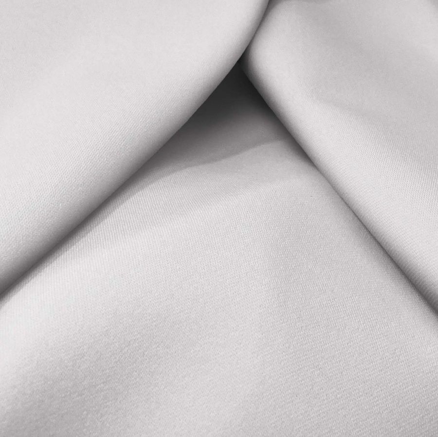 La tela base es la Sarga Bielástica - Lisboa, compuesta por 97% de poliéster y 3% de elastano, con un gramaje de 209 gr/m2 y un ancho de 150 cm. El color liso impreso es blanco con tonalidades de nieve, con un contenido de CMYK de 0 3 1 0. Este color crea una sensación de frescura y limpieza, simbolizando la pureza y la claridad. Las tonalidades suaves se combinan perfectamente con una amplia gama de tonos, especialmente con los colores pastel y claros.
