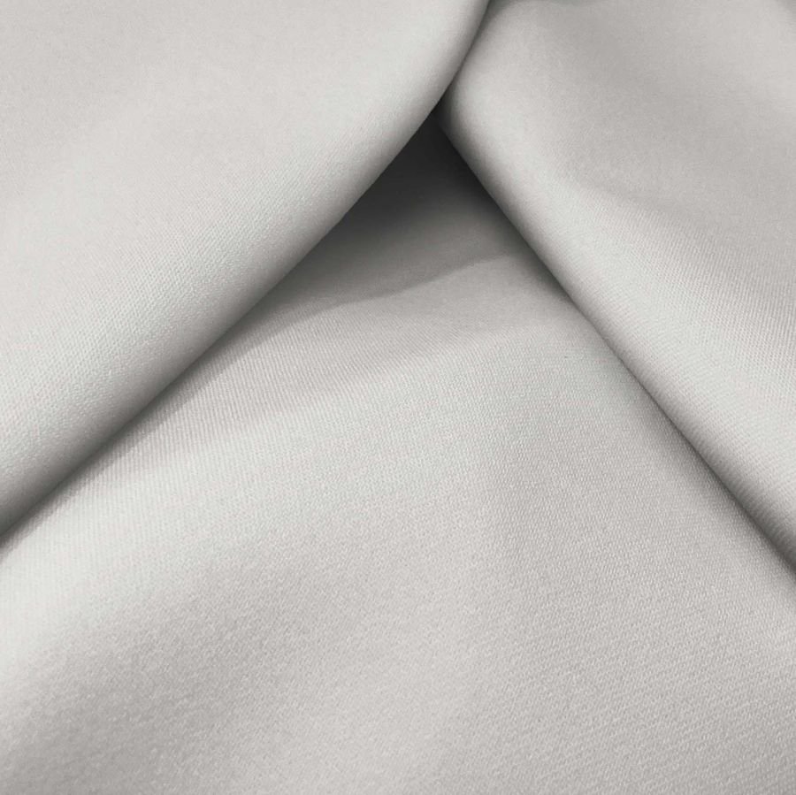 La tela base, Sarga Bielástica - Lisboa, es una tela de sarga compuesta mayormente por 97% de poliéster y 3% de elastano, con un gramaje de 209 gr/m2 y un ancho de 150 cm. El color liso impreso es blanco yeso, con una combinación de tinta cian de 9, magenta de 7, amarillo de 11 y negro de 0, dando como resultado un color crema suave con toques leves de amarillo y rosa. Esta tonalidad neutra y elegante combina a la perfección con colores como el gris y el negro, así como con otros tonos pastel y neutros. Es importante destacar que la tela está impresa con el color liso a una sola cara por impresión digital textil, no es un tejido tintado sino impreso por una sola cara.