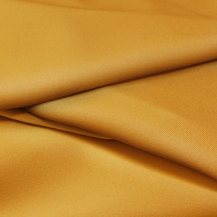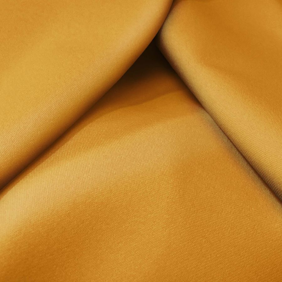 La tela base es la Sarga Bielástica Lisboa, con composición de 97% poliéster y 3% elastano. Su gramaje es de 209 gr/m2 y su ancho es de 150 cm. El color liso impreso es el Naranja Aleación, con valores de CMYK: 18 55 98 7. Este color es simbólicamente asociado a la creatividad y la alegría, y técnicamente se caracteriza por tener una tonalidad intensa y llamativa, y un matiz dorado. Combina especialmente bien con tonos tierra y azul oscuro. Este tejido está impreso con el color liso a una sola cara por impresión digital textil, lo que significa que la tinta penetra en las fibras de la tela, proporcionando una alta calidad de imagen y detalle.