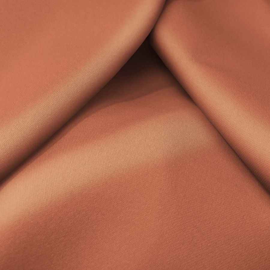 La tela base de este tejido es la Sarga Bielástica - Lisboa, de composición 97% Poliéster y 3% Elastano, gramaje de 209 gr/m2 y ancho de 150 cm. Su color liso impreso es Rojo Cobre, representado por el CMYK 17 65 67 5. Este color refleja pasión, fuerza y energía, combinando los tonos del rojo intenso y el cobre metálico, aportando un efecto brillante y de alto contraste. Se combina muy bien con otros colores cálidos como el amarillo y el naranja, e incluso con tonos neutros como el beige o el blanco.
