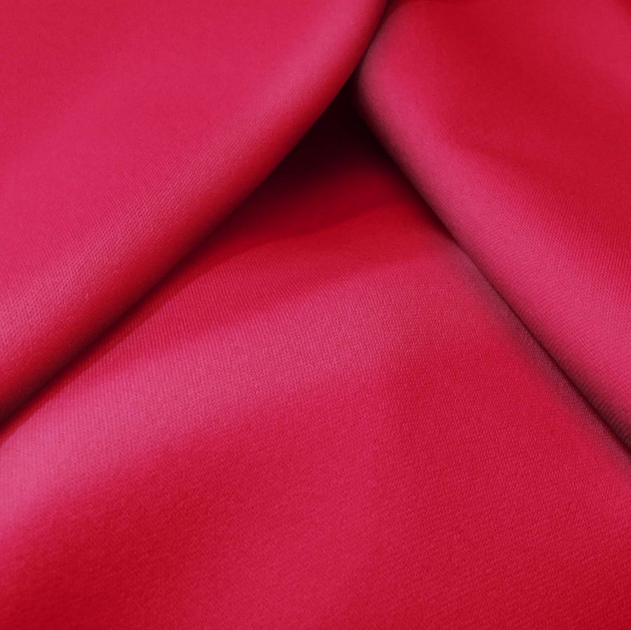 La tela base de esta prenda es la Sarga Bielástica - Lisboa, con una composición de 97% poliéster y 3% elastano. El color liso impreso es el Rojo Escarlata Gobelinos, con un CMYK de 18 100 77 8. Este color se caracteriza por ser intenso y vibrante, con una tonalidad roja ligeramente anaranjada que simboliza la pasión y el dinamismo. Combina perfectamente con tonos amarillos, naranjas, morados, verdes y negros, dotando a la prenda de un toque moderno y elegante. La tela está impresa con el color liso a una sola cara por impresión digital textil, lo que permite una alta definición en el detalle y una amplia gama de colores.