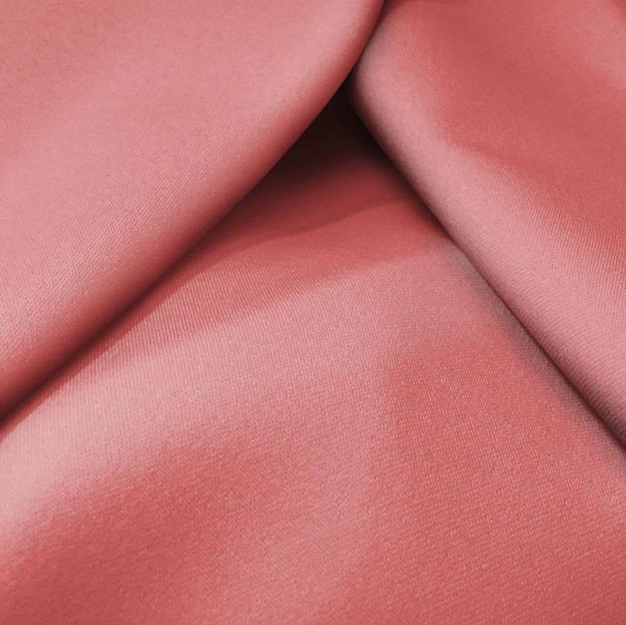 La tela base es la Sarga Bielástica - Lisboa, compuesta por 97% poliéster y 3% elastano, con un gramaje de 209 gr/m2, ancho de 150 cm y color liso impreso en Fuzzy Wuzzy (CMYK: 16 69 51 5). Este color es un rojo oscuro y tosco que se mezcla bien con tonos marrones y verdes oscuros, creando una vibrante sensación otoñal.