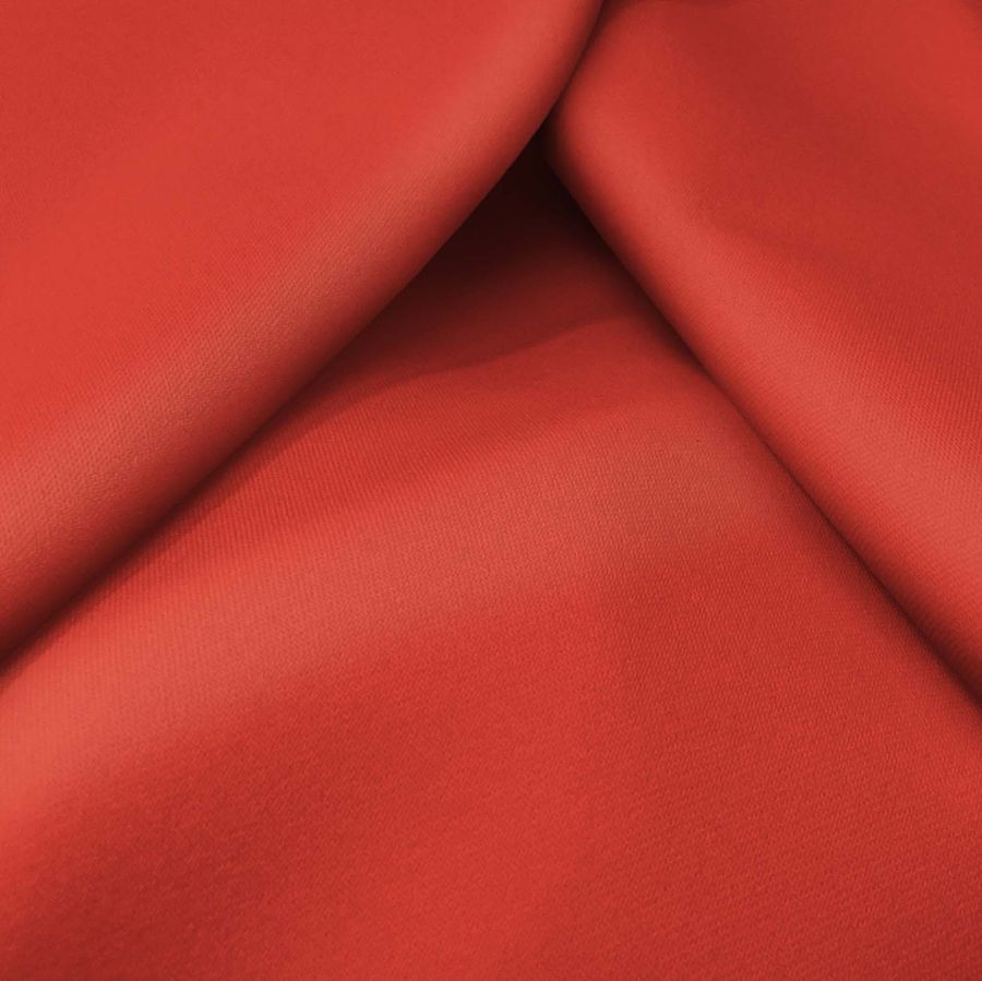 La tela base de este producto es la Sarga Bielástica - Lisboa, compuesta por 97% de poliéster y 3% de elastano, con un gramaje de 209 gr/m2 y un ancho de 150 cm. El color liso impreso es un vibrante rojo CG, con un CMYK de 5 87 82 0. Este color secundario se caracteriza por ser intenso y brillante, con un tono rojizo que resulta sofisticado y perfecto para prendas y accesorios de moda. El rojo CG combina especialmente bien con otros colores como el blanco, el negro, el gris y el azul oscuro, realzando su impacto visual y creando un contraste armonioso.