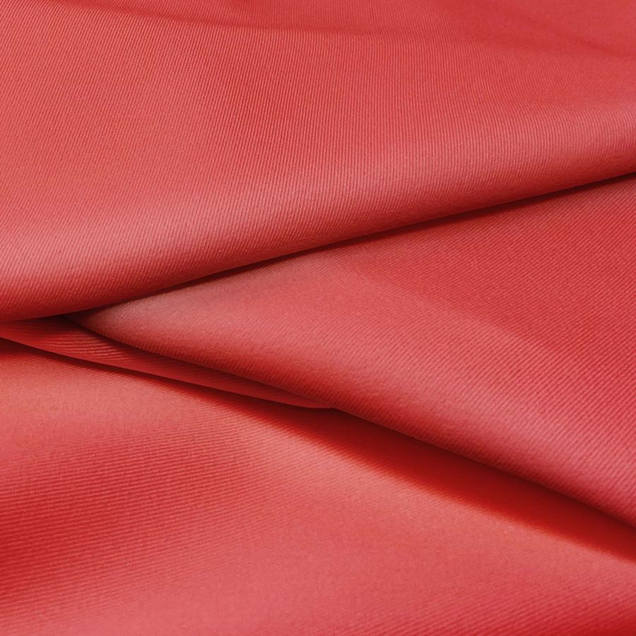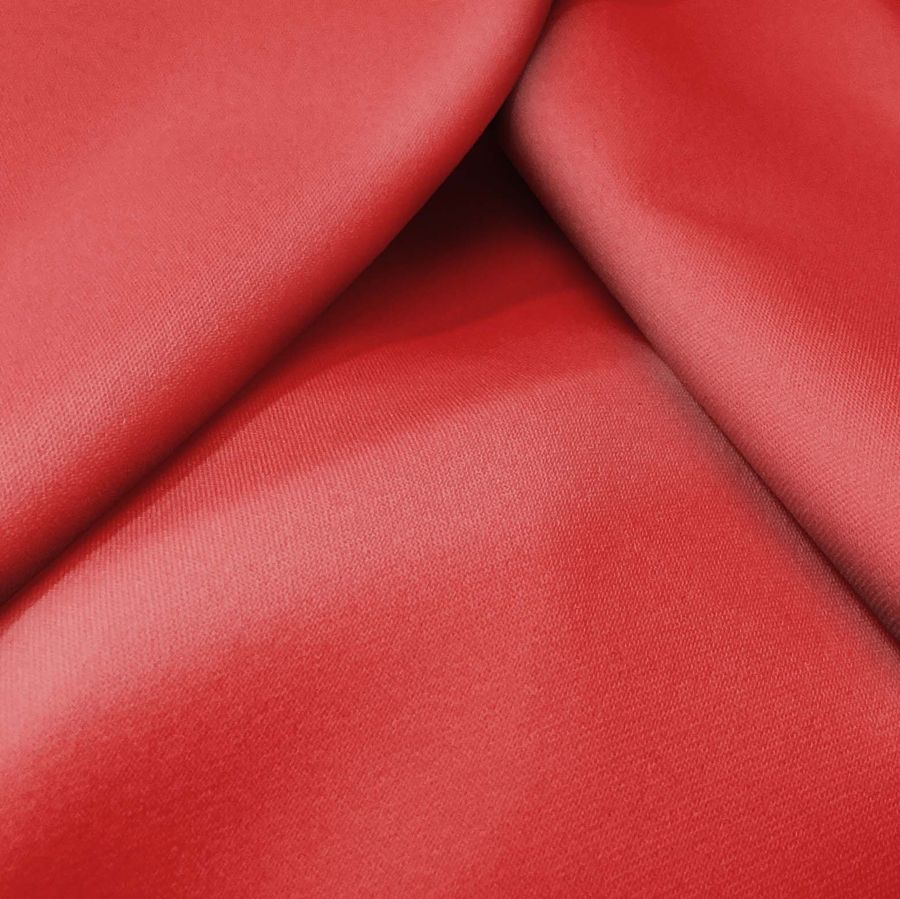 La tela base, Sarga Bielástica - Lisboa, está compuesta por un 97% de poliéster y un 3% de elastano, tiene un gramaje de 209 gr/m2 y un ancho de 150 cm. El color liso impreso en esta tela es un Rojo Persa con los atributos CMYK de 13 91 80 4. Este color se distingue por ser intenso y profundo. Su tonalidad magenta se combina de forma armónica con colores que estén dentro de su misma gama cromática, como el rosa intenso, el borgoña y el vinotinto. También se puede combinar con tonos más neutros como el negro o el blanco.
