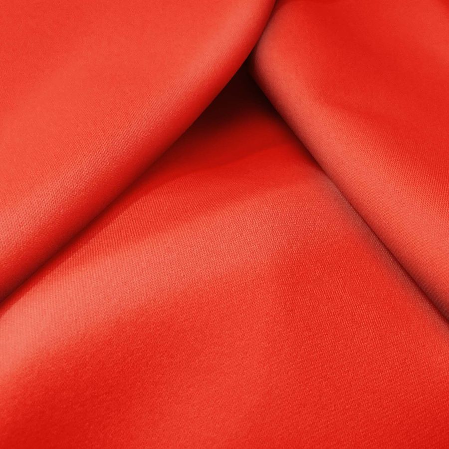 La tela base Sarga Bielástica - Lisboa tiene una composición de 97% poliéster y 3% elastano, con un gramaje de 209 gr/m2 y un ancho de 150 cm. El color liso impreso es rojo ryb, con una tinta magenta y yellow al 89% y 0% de tinta cyan y tinta black, reflejando su contenido en CMYK de 0 89 89 0. Este color secundario se puede interpretar como un rojo intenso y vibrante, que simboliza la pasión y la energía. Además, combina muy bien con colores neutros como el blanco, el negro y el gris, así como con tonos complementarios como el verde y el azul.