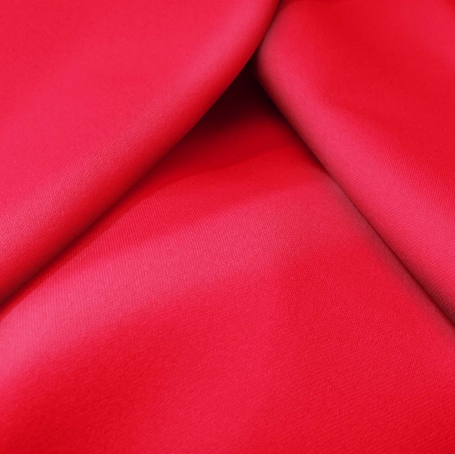 La tela base de este tejido es la Sarga Bielástica - Lisboa, con una composición de 97% POLIÉSTER y 3% ELASTANO y un gramaje de 209 gr/m2. Su ancho es de 150 cm y su color liso impreso es Rojo Rubicundo con un CMYK de 0 95 76 0. Este color se puede describir como intenso y vibrante, evocando pasión y energía. Con un toque de magenta y amarillo, su combinación complementaria incluye tonos verdosos y lilas.