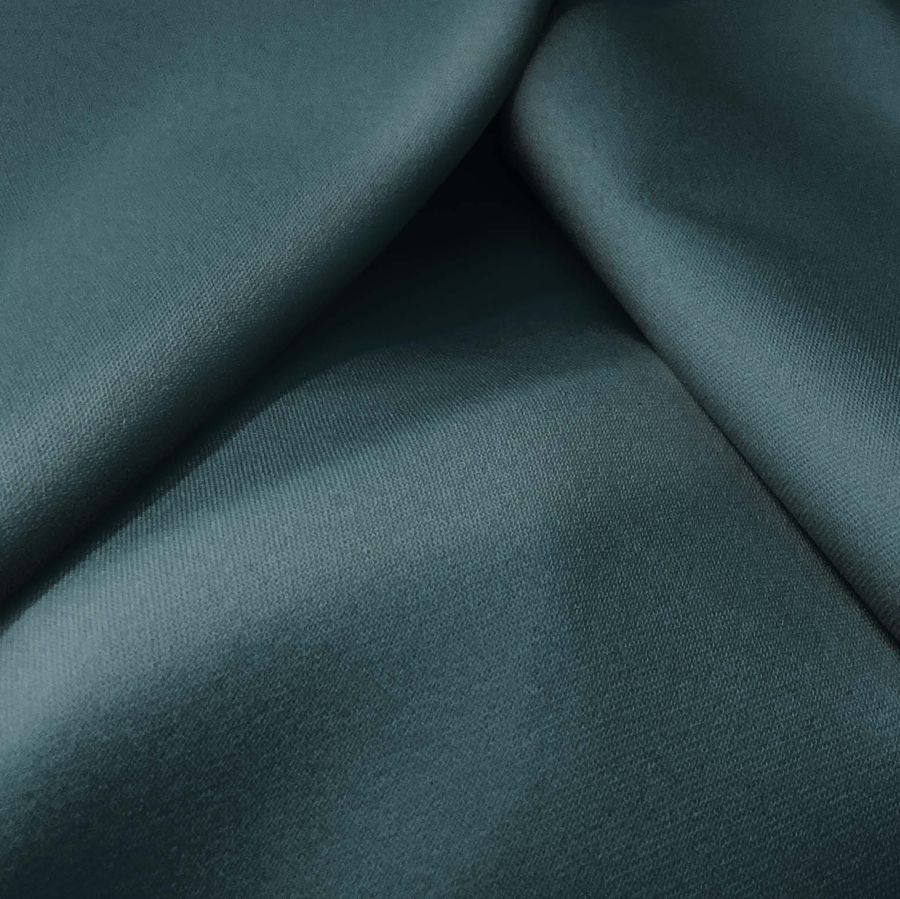La tela base Sarga Bielástica - Lisboa, compuesta por 97% poliéster y 3% elastano, tiene un gramaje de 209 gr/m2 y un ancho de 150 cm. El color liso impreso es un verde azulado (verde azuloso), con un CMYK de 84 54 55 59. Este color simboliza la serenidad y la tranquilidad, y técnica-mente, su pigmentación surge de combinar tinta Cyan, Magenta, Yellow y Black de manera equilibrada. Combina perfectamente con colores como el blanco, negro, gris y crema.