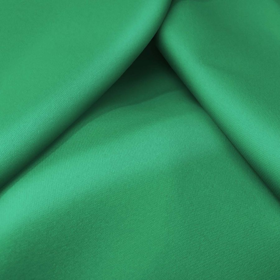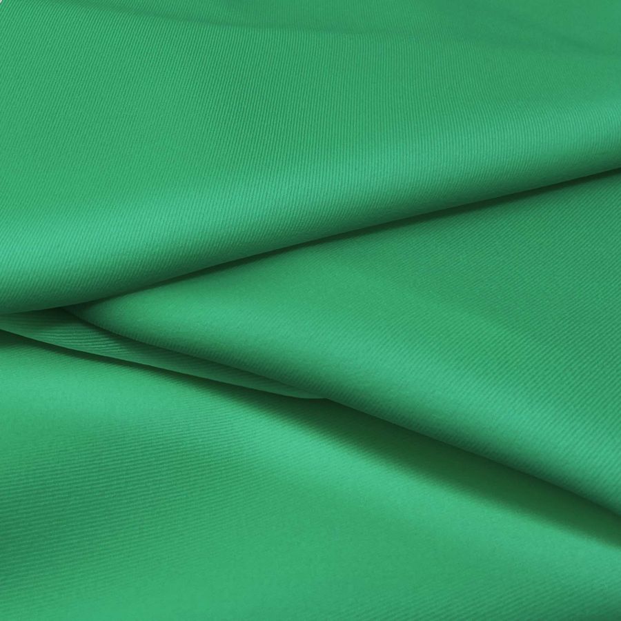 La tela base, Sarga Bielástica - Lisboa, es una sarga compuesta por 97% poliéster y 3% elastano, con un gramaje de 209 gr/m2 y una anchura de 150 cm. El color liso impreso es un vibrante color verde Kelly con un CMYK de 77 12 73 1. Este color, simbólicamente, transmite positivismo y vitalidad. Técnicamente, su alto valor de cyan complementa bien con tonos de azul claro, mientras que su alto valor de yellow se coordina con tonos de naranja y marrón claro. Es importante destacar que el tejido está impreso con el color liso a una sola cara por impresión digital textil, lo que significa que no es un tejido tintado sino impreso por una sola cara.