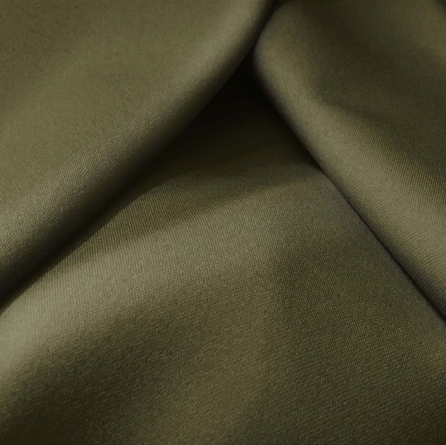 La tela base de este tejido es la Sarga Bielástica - Lisboa, compuesta por un 97% de poliéster y un 3% de elastano, con un gramaje de 209 gr/m2 y un ancho de 150 cm. El color liso impreso en la tela es una combinación de verde y pardo, reflejado en un CMYK de 63 56 87 66. Este color secundario tiene reminiscencias terrosas junto con vibrantes tonos verdes, combinando perfectamente con marrones, ocres, grises, azules y negros. Es importante destacar que la tela está impresa con el color liso a una sola cara por impresión digital textil.