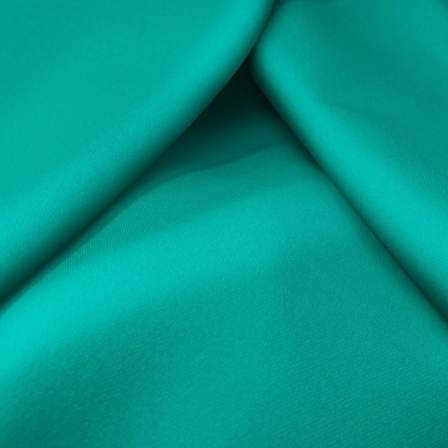 La tela base es la Sarga Bielástica - Lisboa, compuesta por un 97% de poliéster y un 3% de elastano, con un gramaje de 209 gr/m2 y un ancho de 150 cm. Su color liso impreso es el Verde Persa, con un CMYK de 78 7 51 0. Este color se caracteriza por su frescura y vitalidad, con un toque de misterio y elegancia que lo convierte en una opción ideal para prendas de vestir y accesorios.
