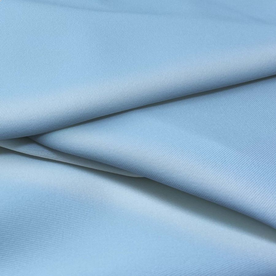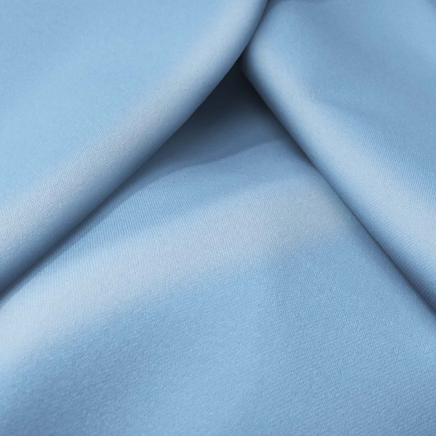 La tela base, Sarga Bielástica - Lisboa, compuesta de 97% poliéster y 3% elastano con un gramaje de 209 gr/m2 y un ancho de 150 cm, se presenta en un color liso impreso en tonos de azul cielo, con un contenido de tinta cyan del 45 y de magenta del 14. Este color se caracteriza por su frescura y suavidad, que lo hacen ideal para aplicaciones en moda y textil/hogar. Además, combina muy bien con otros tonos de azul, verdes y neutros.