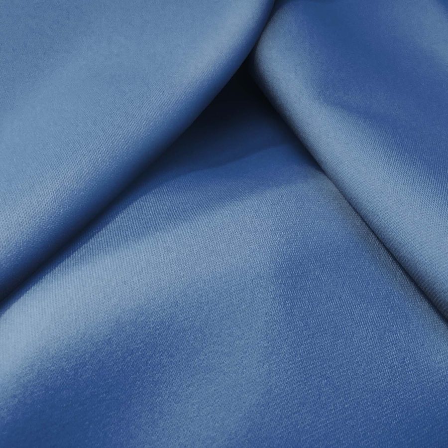 La tela base Sarga Bielástica - Lisboa, de 209 gr/m2 y composición 97% POLIÉSTER y 3% ELASTANO, presenta un color liso impreso en tono Azul Clemátide, cuyo CMYK es 82 59 24 8. Este color se describe como un azul vivo y luminoso, con toques de violeta y que combina muy bien con tonos claros como el blanco y el beige, así como con colores oscuros como el gris y el negro. Cabe destacar que la tela está impresa con el color liso a una sola cara por impresión digital textil.