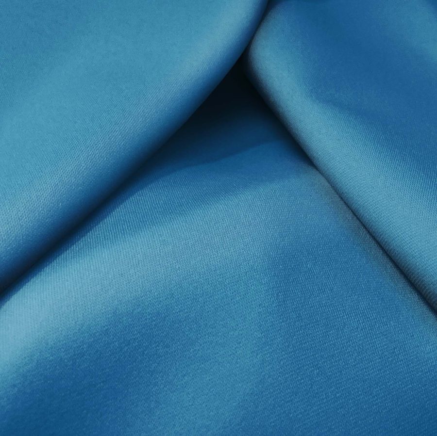 La tela base, Sarga Bielástica - Lisboa, está compuesta por un 97% de poliéster y un 3% de elastano, con un gramaje de 209 gr/m2 y un ancho de 150 centímetros. El color liso impreso en esta tela es de un Azul Cosmos, con una combinación de tintas en CMYK de 87 50 25 9. Este tono secundario es un color intenso y profundo que evoca la noche estrellada, y se combina perfectamente con colores como el plateado, el blanco y el negro para lograr un efecto elegante y sofisticado.